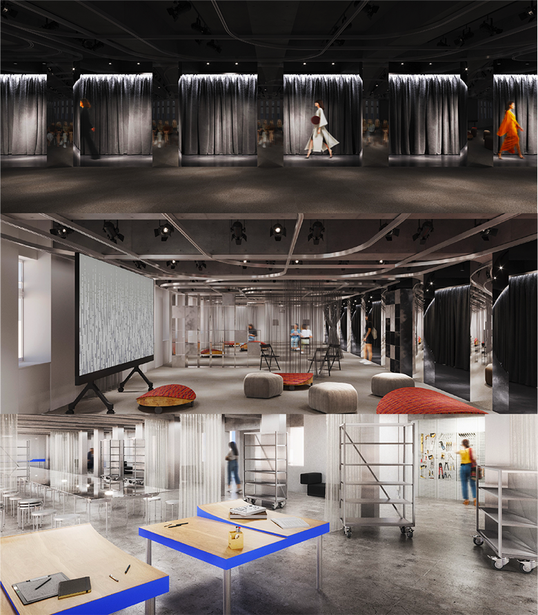 3Dプリンターや一人一台のMacなど、最新設備をそろえたクリエイティブスタジオを中心に、モノづくりの最先端に触れることのできる空間です。ギャラリーのように、作品をディスプレイする什器もそろえ、アート作品を展示。さながら美術系の学校にいるように、常に、お互いに刺激しあえるアトリエのような空間です。廊下とアトリエはガラス製の窓で仕切られ、すべての教室が見渡せるようになっていて、作業の様子がどこにいても見える仕掛け。廊下も、単に通行する場所ではなく、人が集まる場としても使えます。