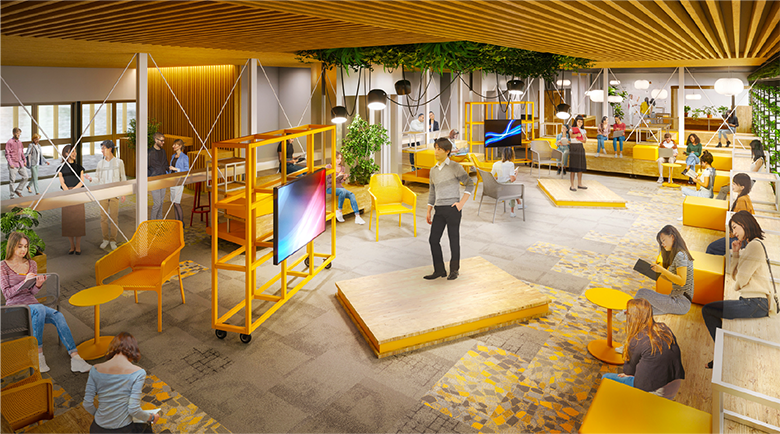 ウォール2面にLEDビジョンを配したスタジオ空間には、ステージも設置。双方向の授業はもちろん、海外提携校とのオンライントークショーや、生徒のプレゼンテーション、音楽・ダンスなどのステージとしても使用できます。スマホやモニターサイズではない大迫力画面での学びは、教科書やタブレットだけの授業のイメージを一掃してくれるでしょう。また、スタジオは、学校説明会や、保護者との交流、地域との共同イベントなど、本校が目指す「社会と密接に繋がる学校」の姿を可能にする開かれた空間でもあります。