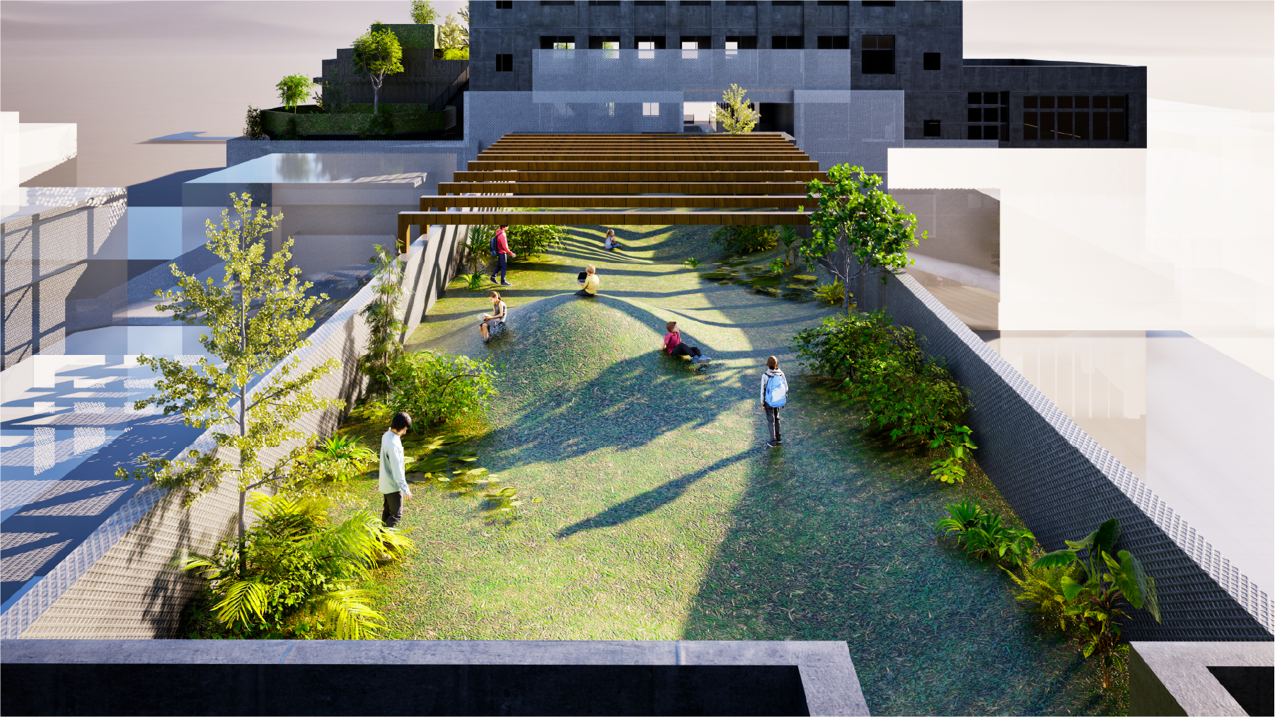 多目的室は最大収容人数60人のスタジアム空間のようにデザイン。スタジアムのような雛壇を模した可動式のベンチを配置し、授業やイベント内容によって自由なスペースづくりができる空間です。