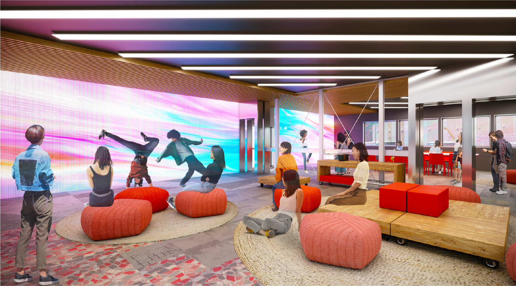 ウォール2面にLEDビジョンを配したスタジオ空間には、ステージも設置。双方向の授業はもちろん、海外提携校とのオンライントークショーや、生徒のプレゼンテーション、音楽・ダンスなどのステージとしても使用できます。スマホやモニターサイズではない大迫力画面での学びは、教科書やタブレットだけの授業のイメージを一掃してくれるでしょう。また、スタジオは、学校説明会や、保護者との交流、地域との共同イベントなど、本校が目指す「社会と密接に繋がる学校」の姿を可能にする開かれた空間でもあります。