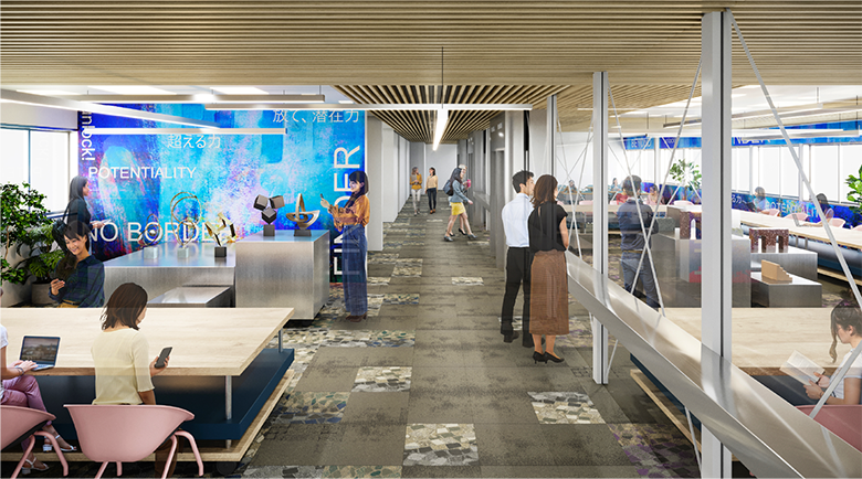 エントランスからガラス越しに見ることができ、FINDER BASEのクリエイティビティと自由を象徴する場となります。
